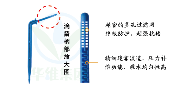 滴箭具有灌溉精準、出水均勻等優點,廣泛用于茄果類蔬菜、水果、苗木、花卉等作物,是盆栽作物及立體綠化等最合適的灌水器。箭頭插入土壤或基質中固定導流;柄部插入內徑3mm左右的毛管中。